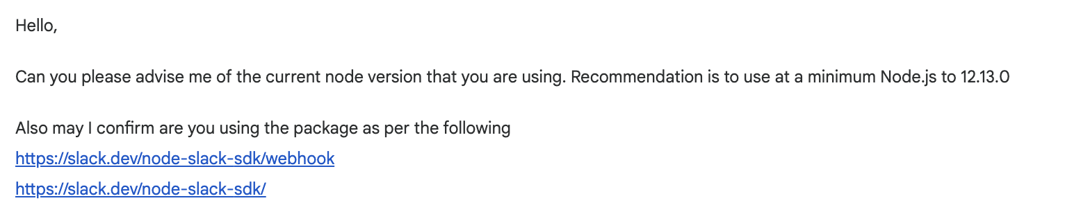 Slack 담당자는 노드 버전 및 패키지 사용을 권고 했습니다. 하지만 저의 node version은 16.x 였고 이미 @slack/webhook을 사용하고 있었습니다. 지속적으로 메일을 주고받았지만 확실한 해결책이 나오지 못했습니다. 메일을 주고받으면서도 계속 구글링을 했고 몇몇 예제에서 수신 웹후크 URL을 config 파일로 분리시킨 것을 보고 혹시나 하는 마음에 URL을 config 파일로 분리시켜 실행을 해봤습니다. 파일을 분리시키고 실행을 해보니 에러없이 메시지가 잘 가게 되었습니다. 하핫..